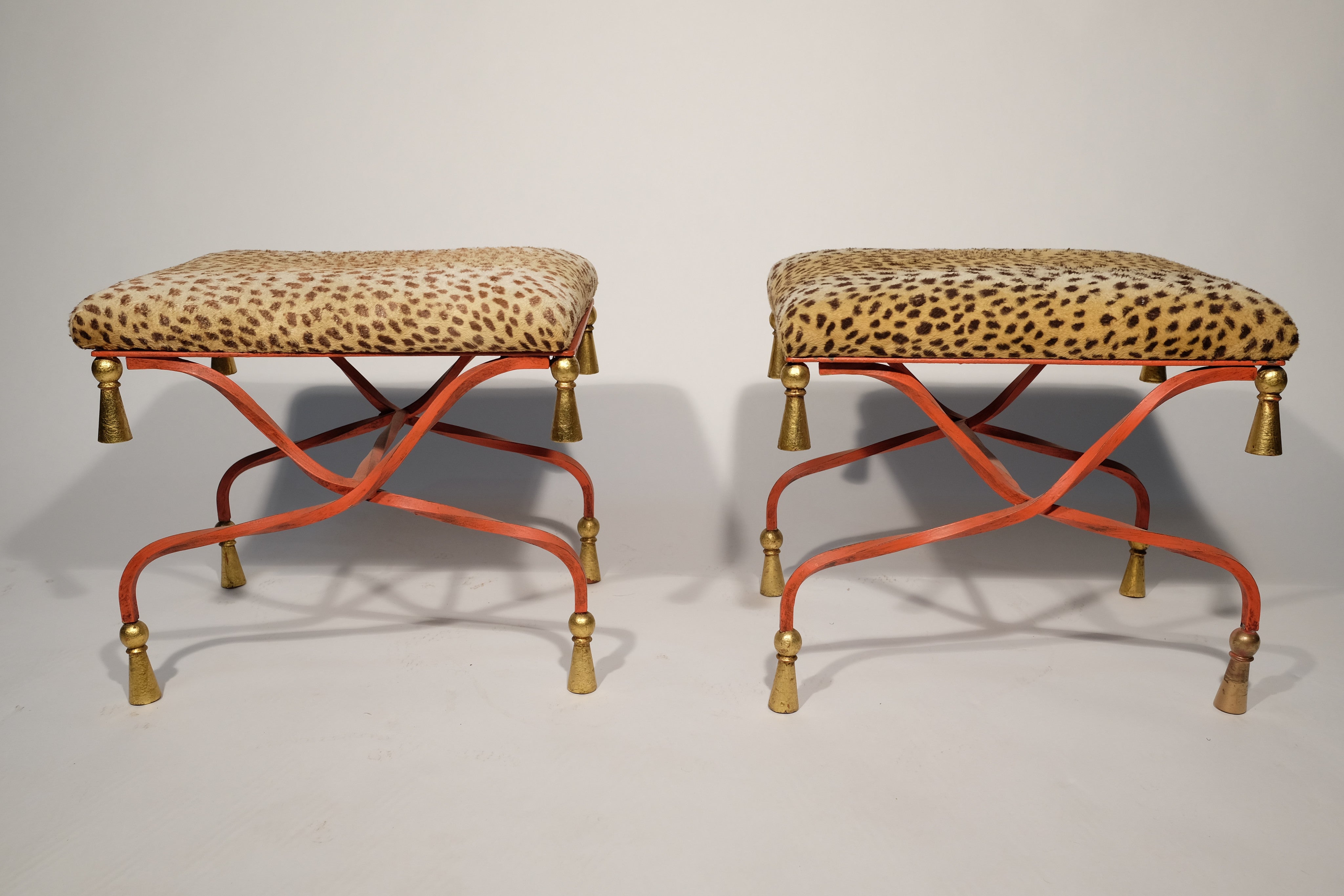 Decorative pair of cast iron painted stools with gilded tassel style feet upholstered in leopard velvet.