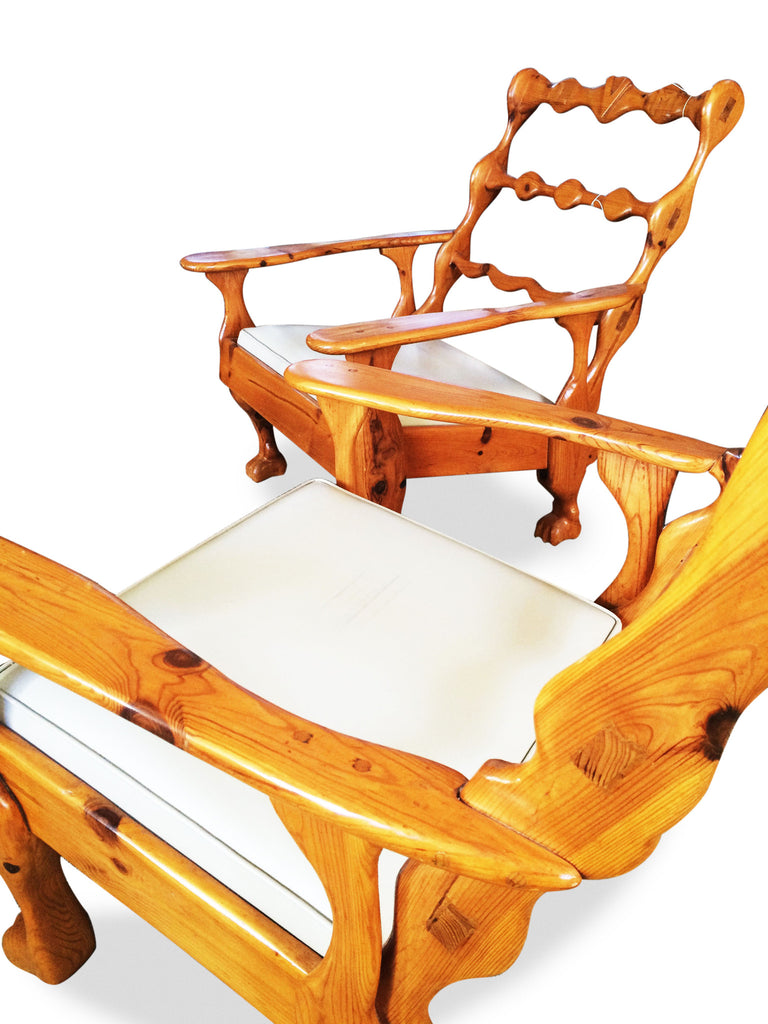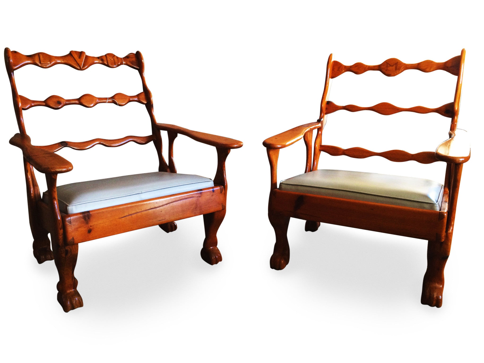 Studio carved His & Her armchairs made of solid wood and organic form, one carved "M" to top rail, the other carved "LVM" to top rail; both in good condition